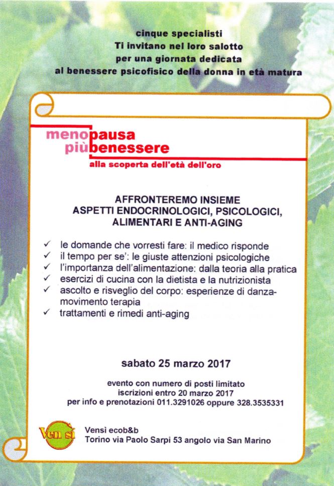 L’incontro ha le caratteristiche di una giornata da trascorrere in un ambiente “familiare” insieme a professioniste che si occupano del benessere generale delle donne oltre i 45 anni di età. La giornata inizia con una colazione “bio”, bilanciata sul piano nutrizionale ed offerta dalla sede ospitante – il BIO B&B Vensì Via P. Sarpi 53 10134 Torino, www.vensi.it– e prosegue con un programma articolato in cui si susseguono brevi relazioni sul tema analizzato da vari punti di vista: medico, psicologico, nutrizionale, estetico e momenti di attività guidate. Tra queste: attività di cucina con la dietista e nutrizionista per confezionare insieme un pasto equilibrato e detossicante (che viene consumato a pranzo) e momenti di danza-terapia sotto la guida di una psicologa. Ampio spazio viene lasciato a momenti di interazione in modo che le partecipanti possano porre domande ed esporre dubbi o richieste specifiche alle professioniste.